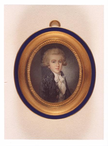 Acquerello su avorio raffigurante un fanciullo di tre quarti, a mezzo busto; cornice ovale in legno dorato con contorno esterno in smalto azzurro e bordo interno in bronzo dorato ad antemi. Miniatura attribuita a Villers, databile alla fine del XVIII secolo.