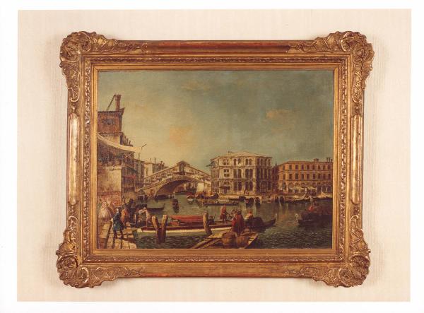 - NOTIZIE STORICO CRITICHE L'opera è parte dell'ampio nucleo donato al FAI nel 1995 da Alighiero de' Micheli. Il dipinto raffigura una veduta veneziana con il Ponte di Rialto visto da nord, il rinascimentale palazzo dei Camerlenghi a destra, e a sinistra, in scorcio, palazzo Civran. Il dipinto venne eseguito da Michele Marieschi, pittore e incisore veneziano, inizialmente attivo come scenografo, divenuto poi famoso come autore di vedute e "capricci". La veduta del Ponte di Rialto venne ripresa più volte da Marieschi, il quale si distinse dai modelli del contemporaneo Canaletto per l'esecuzione a pennellate più dense e corpose, per un'interpretazione più scenografica e per la precisione volumetrica dello spazio architettonico. Le figure in primo piano sono riferibili al pittore bellunese Gaspare Diziani, presso cui Marieschi si formò in giovane età. Questa veduta, insieme alla "Veduta del Campo dei Frari", faceva parte nell'Ottocento della collezione Lepke di Berlino; dopo varie vicende collezionistiche, le opere rientrarono in Italia nel 1949 e furono esposte nel 1967 alla mostra dedicata ai Vedutisti veneziani del Settecento.