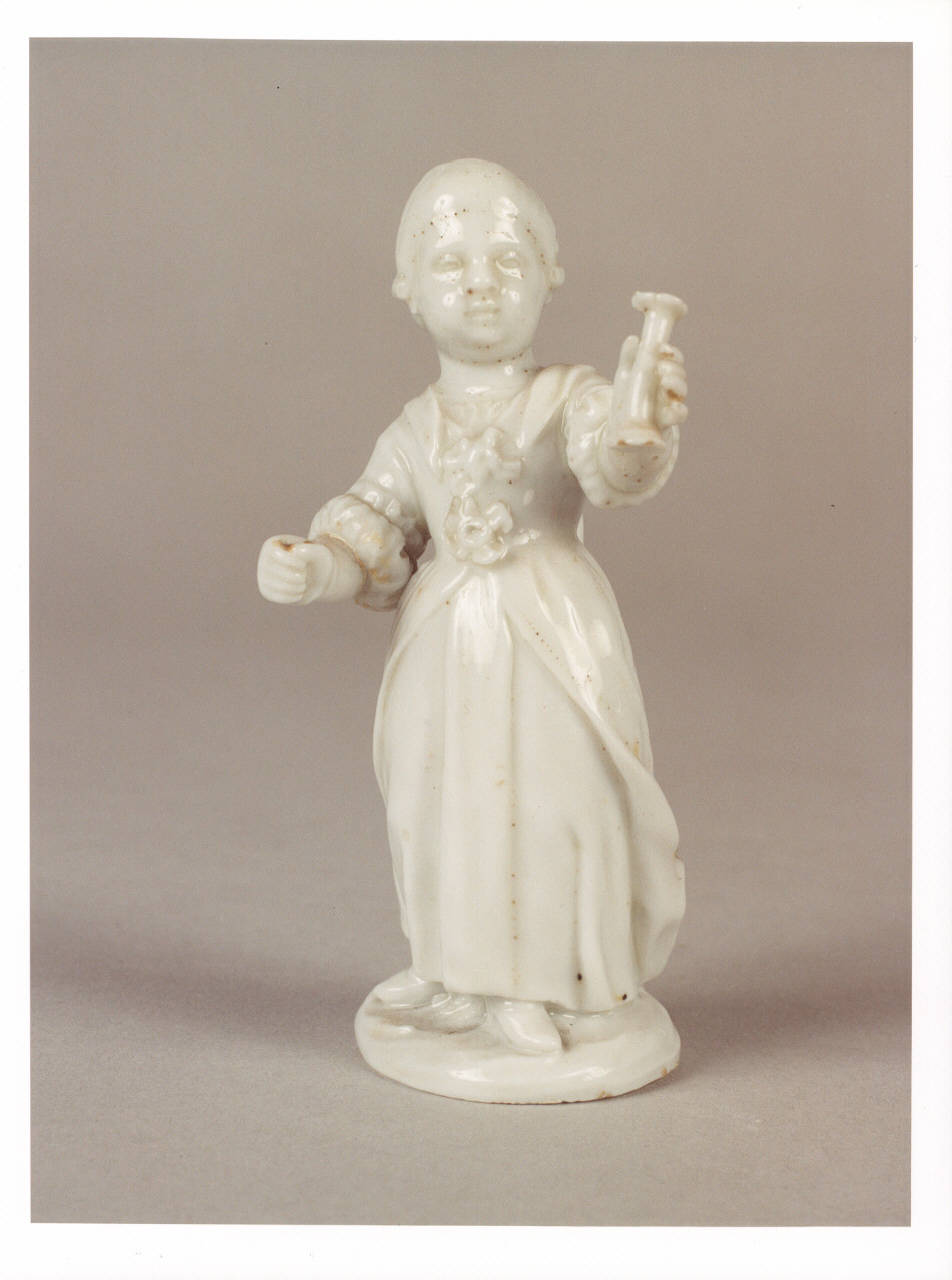 Il pezzo in oggetto raffigura una bambina dall'elegante vestitino formato da una veste liscia con sopraveste con ricamo centrale, il tutto definito in modo delicato, anche se non è particolarmente pregevole l'esecuzione del volto, dovuto all'uso degli stessi stampi, che permettevano da un lato forti risparmi, dall'altro però una omogeneità delle espressioni e delle immagini, le cui uniche varianti erano date dalla diversa impostazione del soggetto. L'impasto è morbido, con una smaltatura bianca piuttosto brillante e lucida.