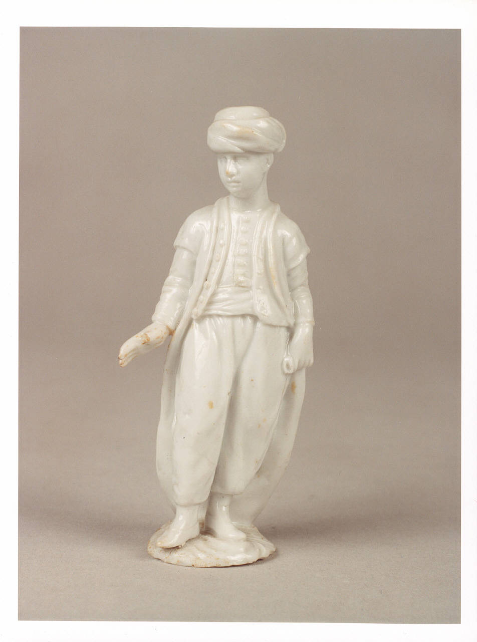 Il pezzo in oggetto raffigura un giovane uomo con turbante sulla testa ed abiti di foggia orientaleggiante, con ampi pantaloni stretti alla caviglia, gilet aperto e camicia con bottoni. Ben definito il volto tondeggiante, dall'espressione intensa. L'impasto è morbido, con una smaltatura bianca piuttosto brillante e lucida.