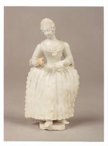 Il pezzo in oggetto raffigura una giovane donna con elegante abito da ballo con corpetto stretto e ampia scollatura, gonna gonfia con pizzi all'orlo e lateralmente. Ben definito il volto tondeggiante, animato da un lieve sorriso e messo in risalto dalla pettinatura raccolta con riccioli laterali. L'impasto è morbido, con una smaltatura bianca piuttosto brillante e lucida.