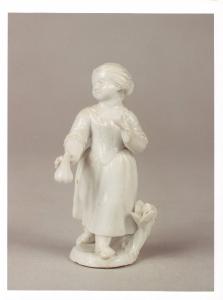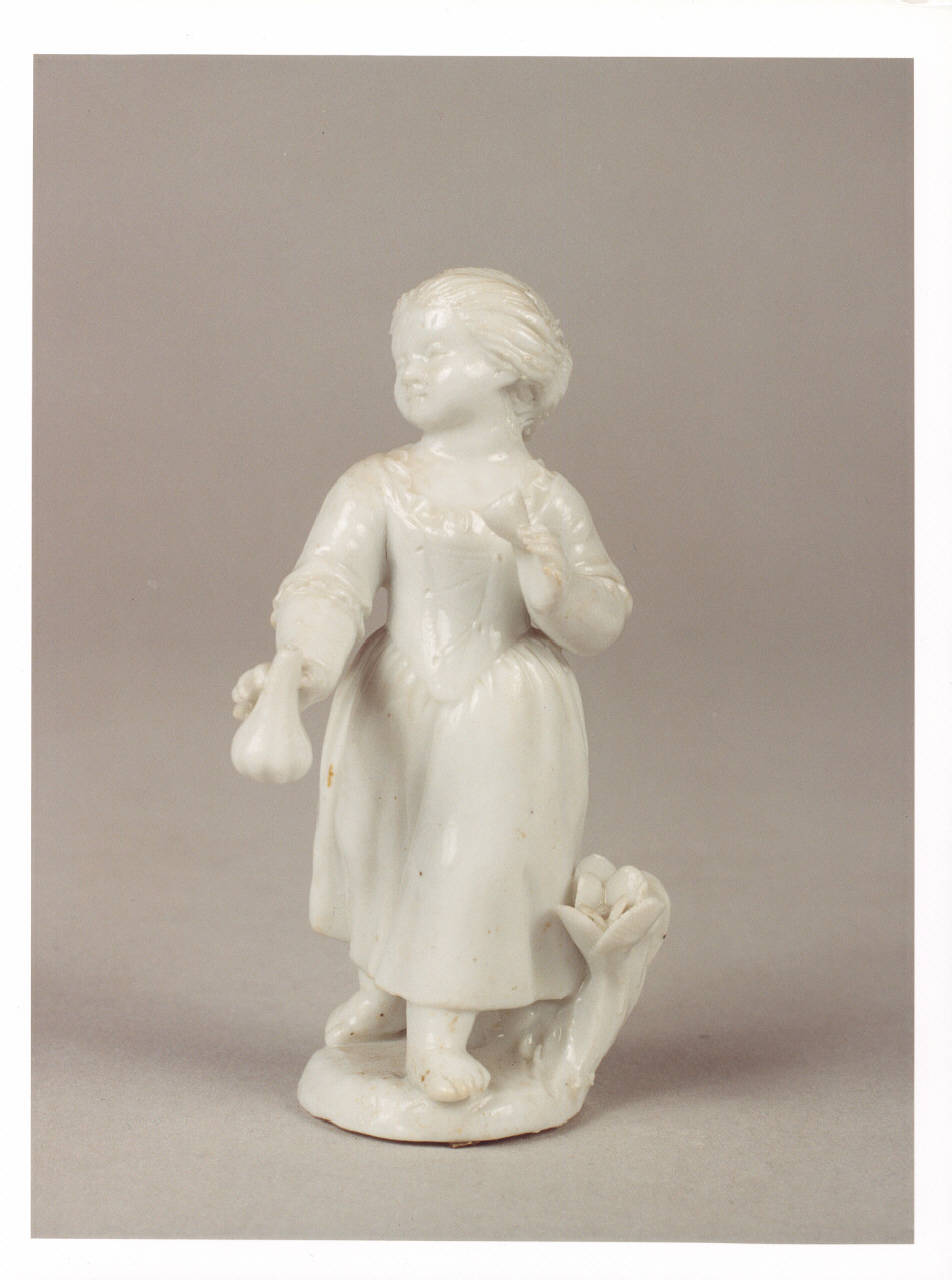 Il pezzo in oggetto raffigura una bambina, mentre cammina, con in mano una pera. Il vestito è formato da un corpetto stretto e da una gonna ampia e liscia. Ben definito il volto tondeggiante, animato da un lieve sorriso e messo in risalto dai capelli mossi e raccolti sul capo. L'impasto è morbido, con una smaltatura bianca piuttosto brillante e lucida.