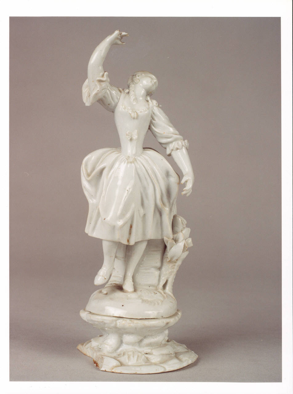 - NOTIZIE STORICO CRITICHE La manifattura Le Nove, vicino a Bassano, nacque nel 1752 per volontà di Pasquale Antonibon, già proprietario di una fiorente fabbrica di maioliche. Ebbe sorti altalenanti a causa della malattia del fondatore che delle diserzioni degli operai, riuscendo comunque a produrre eccellenti porcellane fino al 1800. La produzione di piccole figure si colloca intorno agli anni della fine del settecento, con modelli molto simili fra loro per il riutilizzo di stessi identici stampi, per cui le variazioni erano affidate soprattutto ai panneggi.\nLa statuetta in precedenza si trovava nel piano seminterrato.