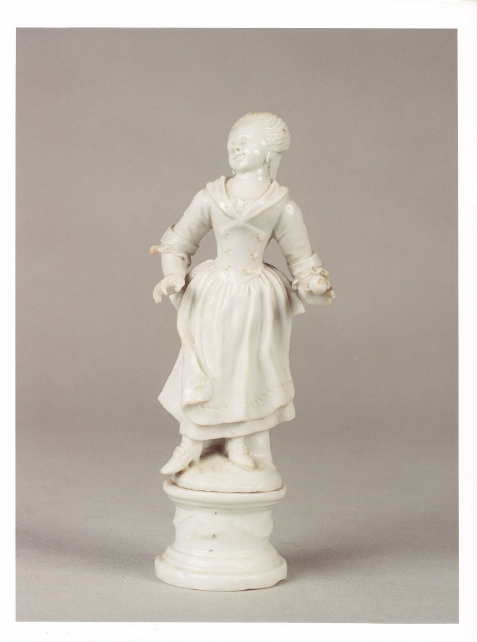 Piccola scultura a tutto tondo raffigurante una giovane donna che regge nella mano sinistra una cipolla.\nSemplice abito dal corpetto stretto con fazzoletto annodato al collo, gonna liscia con grembiule, piccole scarpine con fibbia e tacco. La testa è reclinata all'indietro, imprimendo così un leggero movimento all'intera composizione.