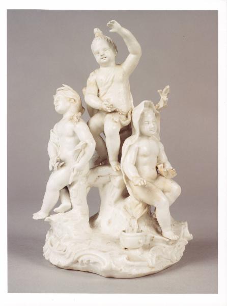 - NOTIZIE STORICO CRITICHE A Este tre fabbriche si dedicarono alla porcellana, tra cui quella di G. B. Brunello, formatosi all'interno della Manifattura Le Nove. La produzione si spinse fino ai primi dell'Ottocento. La porcellana prodotta si caratterizza per la lucidità e per forme originali, come l'allegoria in oggetto in cui le quattro Stagioni sono raffigurate come bambini con un attributo iconografico per identificarle. Pregevole il basamento, con piccole volute, e sorta di ramificazione centrale.\nIl gruppo scultoreo in precedenza si trovava nel piano seminterrato.