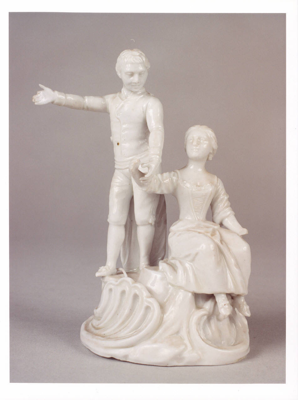 L'opera presenta una scena galante: un uomo e una donna che si tengono per mano. Gli abiti sono piuttosto semplici ed anche la fattura dei volti non è particolarmente pregevole, risultando un po' imbambolati. Bello il basamento a forma di conchiglia. L'impasto è morbido, con una smaltatura bianca piuttosto brillante e lucida.