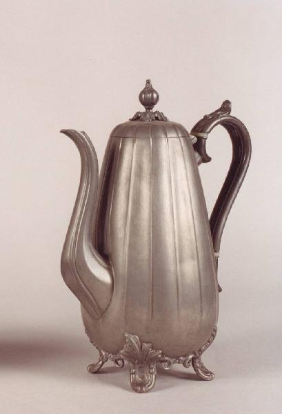 Caffettiera in peltro poggiante su quattro piedini con decoro a scanalature verticali.