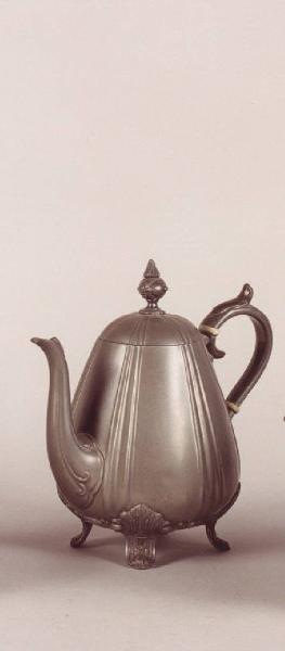 Teiera in peltro con linea molto semplice ed elegante poggiante su quattro piedini; coperchio a cerniera con pomolo.