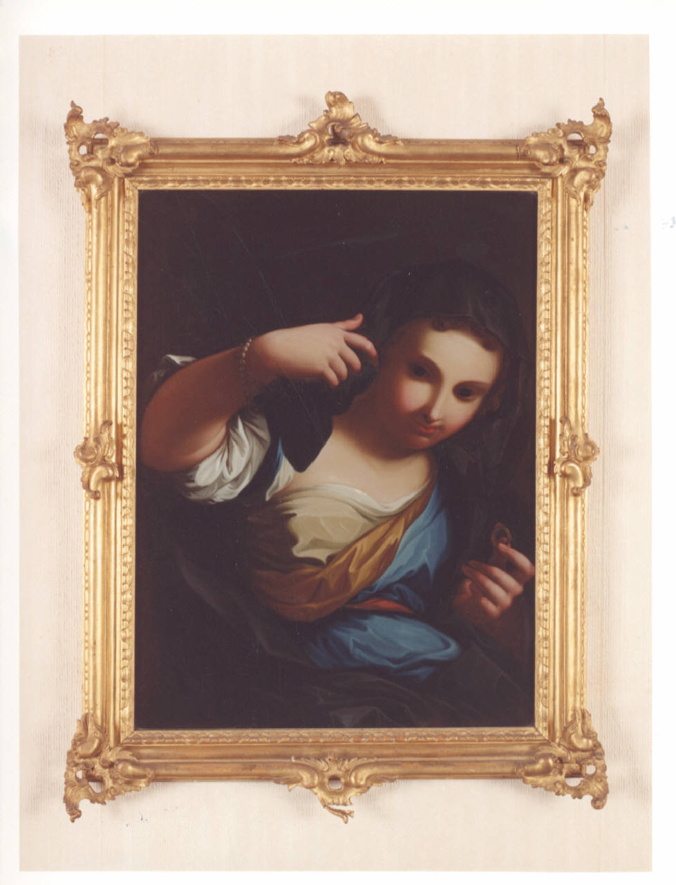 Dipinto su vetro con fanciulla; cornice lignea dorata con decori fogliati angolari e al centro di ogni lato.