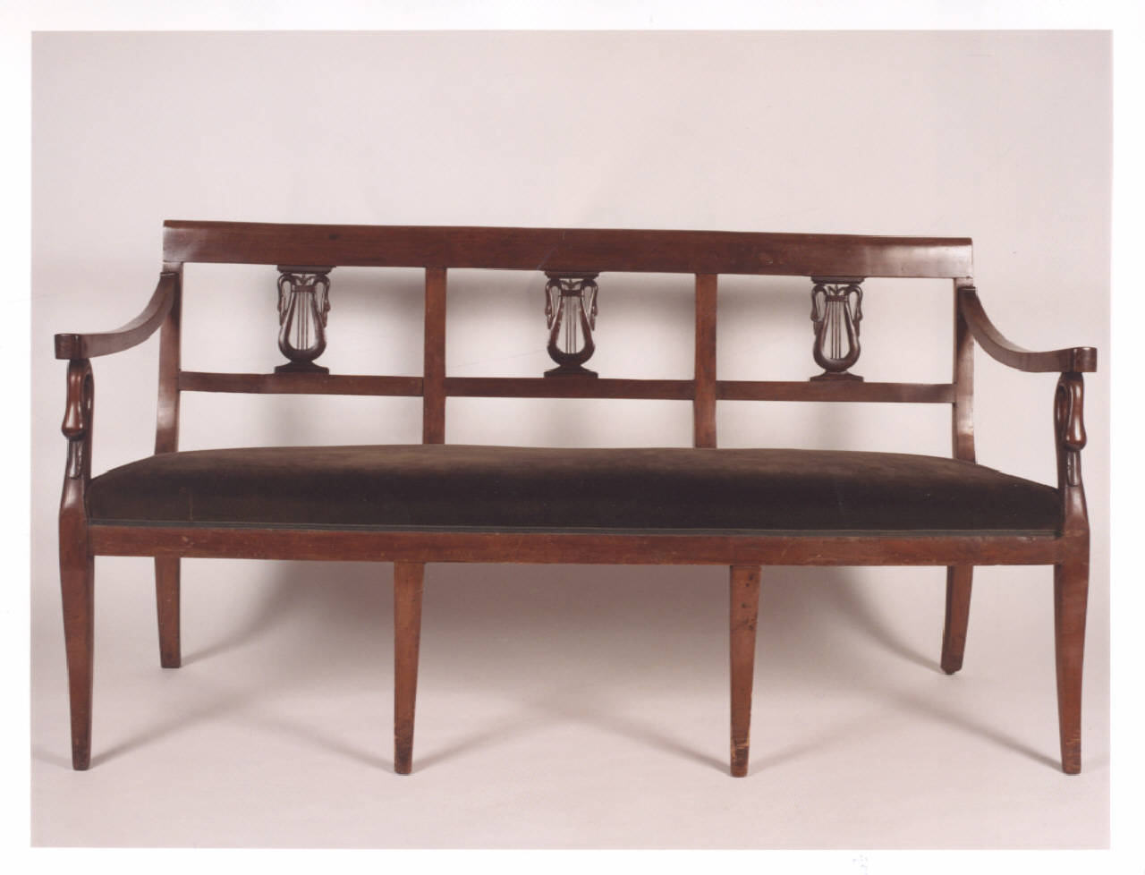 Divano in stile Impero con schienale aperto decorato al centro con tre lire a forma di cigno come gli appoggi dei braccioli.