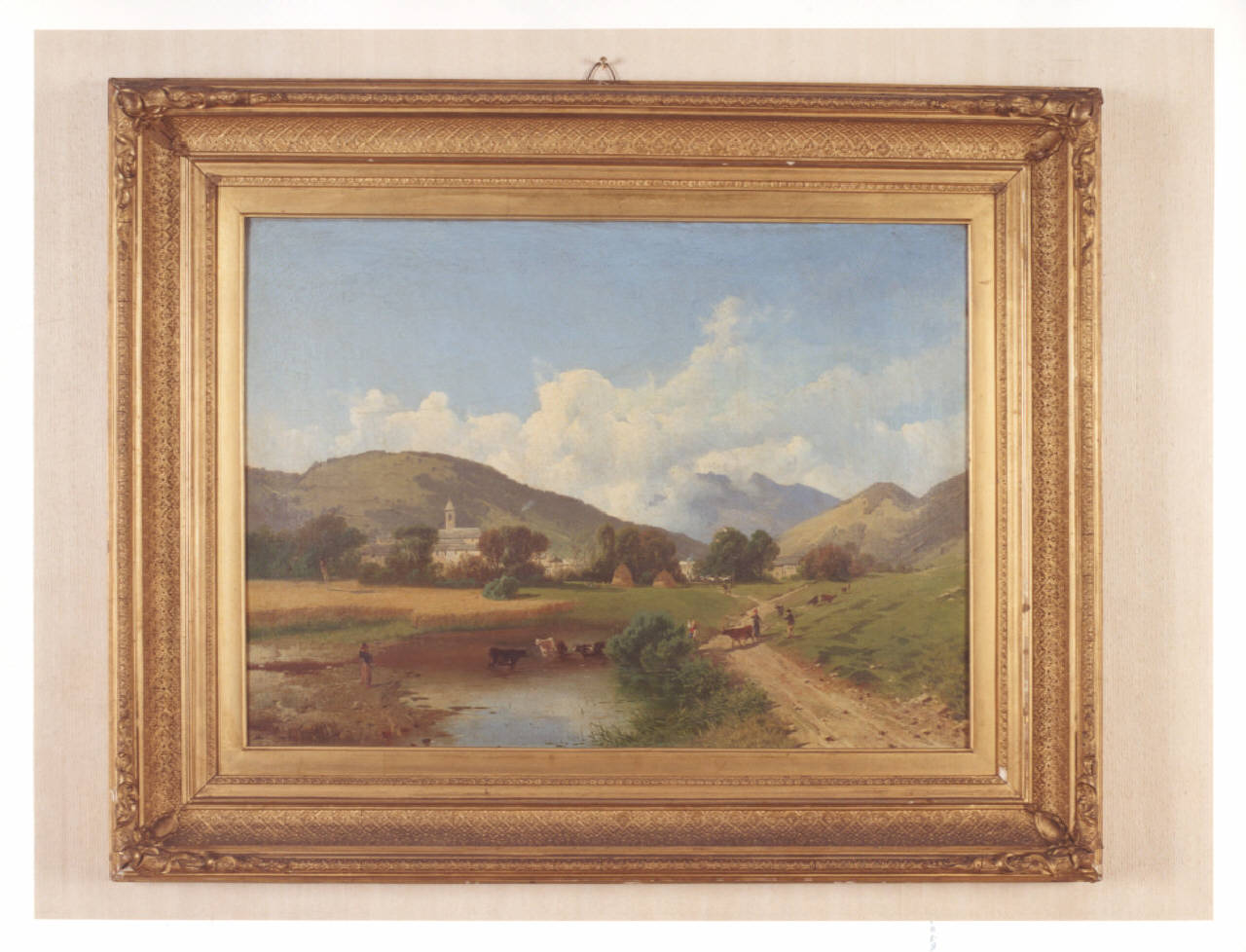 - NOTIZIE STORICO CRITICHE L'opera, già nella collezione delle sorelle Gigina e Nedda Necchi, entra a far parte del patrimonio FAI nel 2001, in quanto parte del lascito di Villa Necchi Campiglio a Milano. Il dipinto rappresenta una veduta su una campagna, appena al di fuori del villaggio abitato, dove vengono fatti pascolare gli armenti. Al momento dell'ingresso in Villa, il dipinto risulta attribuito a Gaetano Fasanotti, pittore lombardo e allievo del bresciano Giovanni Renica grazie al quale è introdotto alla pittura di paesaggio, dopo un breve iniziale periodo di dipinti con soggetti storici (es. "Discesa di Berengario in Italia" conservata presso l'Accademia Carrara di Bergamo). Insegnò all'Accademia di Brera come titolare della cattedra di paesaggio, svolgendo una didattica assai inconsueta per allora, in quanto conduceva gli allievi all'aperto perchè copiassero il vero, favorendo l'inflessione veristica. Fu autore di suggestive vedute milanesi e di piacevoli paesaggi, come illustra l'opera in oggetto, probabilmente realizzata "en plein air".