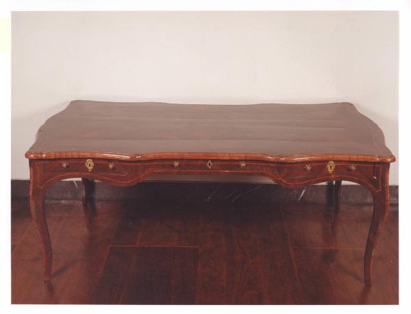 - NOTIZIE STORICO CRITICHE Lo stile Luigi XV trae il nome dal re di Francia, sviluppandosi alcuni anni dopo la sua ascesa al trono (1722) e corrispondente al massimo sviluppo del rococò. A Genova, da cui forse proviene questa importante scrivania, si guarda soprattutto al gusto francese, testimoniato sia dalle impiallacciature sia dall'uso di legni esotici e pregiati come il mogano violetto, tipici degli ebanisti d'oltralpe e che nell'oggetto in esame trovano piena rispondenza. Anche le piccole dorature, che incorniciano le serrature, o che si trasformano in un fiore stilizzato nei pomelli dei cassetti, sono tipiche dello stile ligure.