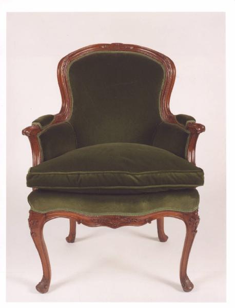 - NOTIZIE STORICO CRITICHE Lo stile Luigi XV trae il nome dal re di Francia, sviluppandosi alcuni anni dopo la sua ascesa al trono (1722) e corrispondente al massimo sviluppo del rococò. La potrona, di manifattura veneta, si caratterizza per l'ampio schienale, che facilitava il riposo, e una decorazione vegetale posta sul bordo dello schienale, sulla profilatura della seduta e sui sostegni tramite un intaglio lievemente aggettante.