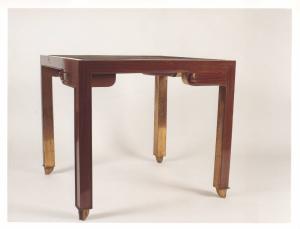 - NOTIZIE STORICO CRITICHE Il tavolo è disegnato ricorrendo a forme geometriche nette e regolari, sm\nussate in corrispondenza dei cassetti porta fiches e dei piedi d¿appoggi\no. La struttura in legno viene messa in risalto dal rivestimento metallico in lamina di bronzo color oro che ricopre i profili interni.