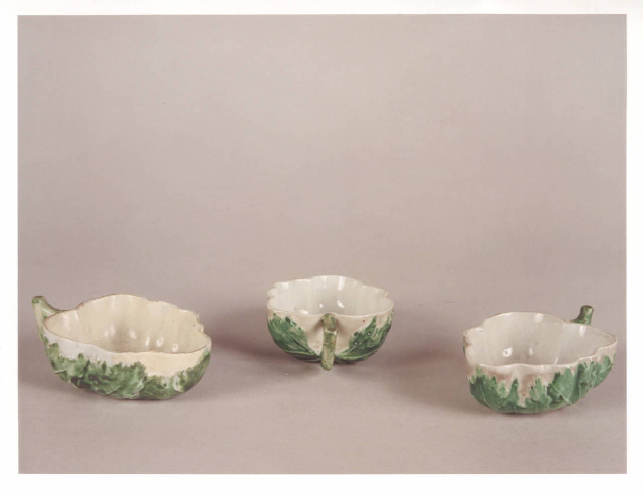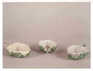 Tre tazzine, con un solo manico, a forma di foglia in porcellana bianca e verde.