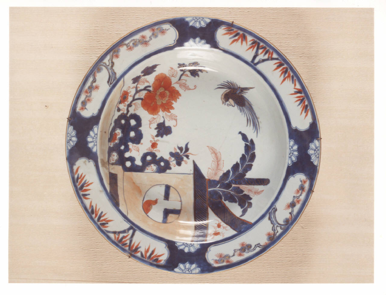 - NOTIZIE STORICO CRITICHE Questo piatto di grandi dimensioni rientra nella produzione di Hizen in stile Ko-Imari, così identificato dal nome del porto, posto a otto chilometri da Arita, in cui il vasellame era imbarcato per essere poi esportato in Europa. Le caratteristiche del Ko-Imari, che predominerà per i primi cinquant'anni del settecento, prevedeva un fondo blu cobalto con decorazioni sopra vetrina in smalto rosso e dettagli in oro. I motivi ornamentali erano costituiti da combinazioni di finestre o cerchi su sfondo campito a decorazioni floreali (a volte anche geometriche). Questo piatto ha un disegno blu cobalto sotto vetrina, con motivo centrale con uccelli, peonie e altri fiori, valorizzati dagli smalti sopra vetrina in rosso e oro. Pregevole nella bordura la presenza del bambù con foglie rosse e di una acacia con i fiori dello stesso tono.
