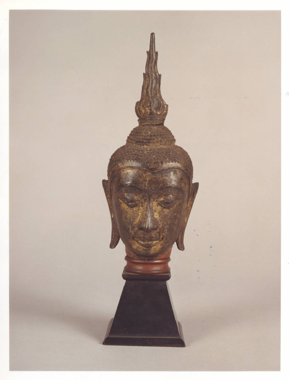 Pregevole testa di Budda in bronzo parzialmente dorato, supporto in legno.\nLa divinità è raffigurata secondo l'iconografia caratteristica: la protuberanza del cranio modellata come una sorta di crocchia appoggiata alla testa, le orecchie dagli enormi lobi a ricordo dei pesanti gioielli. Piuttosto accentuati e ben definiti sono i tratti del volto, in modo particolare gli occhi lanceolati e la bocca.