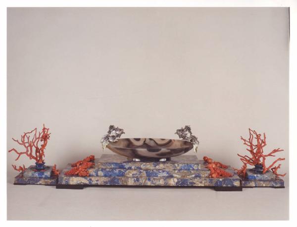 Centrotavola di Alfredo Ravasco composto da tre pezzi impiallacciati in lapislazzulo, ornati da elementi figurativi legati al mondo naturale realizzati in corallo rosso, e da una coppa in agata con i manici a forma di pesce in argento.