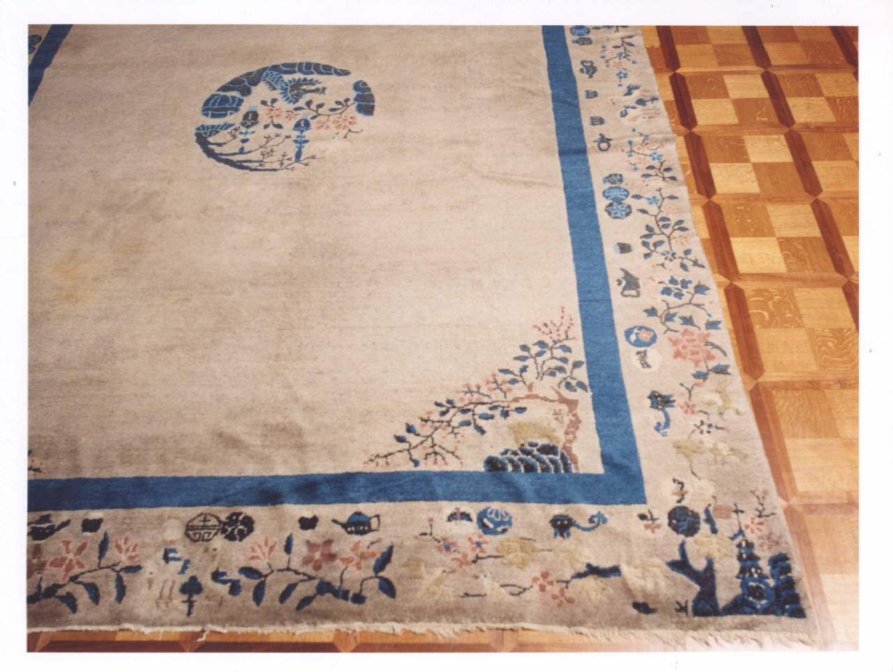 Il tappeto presenta un medaglione centrale, cromaticamente uguale al fondo, costituito da un drago. Nella bordura compare la stilizzazione del monogramma "shou", in cinese "lunga vita", formato da un cerchio oppure caratterizzato da una sagoma allungata. Anche il colore blu utilizzato, onnipresente nella produzione cinese con una ricchissima varietà di toni, è tipico di una produzione che inizia con la metà del XIX secolo e prosegue in quello successivo, sostituito, però, da tinture sintetiche anzichè vegetali.