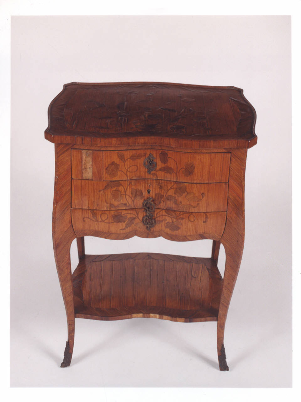 Chiffonière impiallacciata a tre cassetti con decoro di rose e foglie anche sul ripiano leggeremnte sagomato. Sostegni ricurvi con piccoli elementi decorativi in bronzo raccordati fra loro da un sostegno pieno.