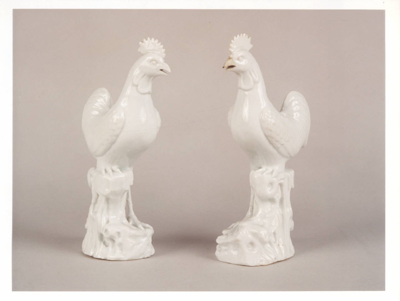 Galli in porcellana blanc-de-chine poggianti su un piccolo basamento di roccia.