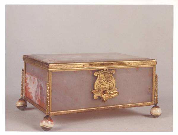 Scatola in agata con montatura in metallo dorato poggiante su quattro piedini rotondi e serratura centrale corredata da chiave; coperchio incernierato.