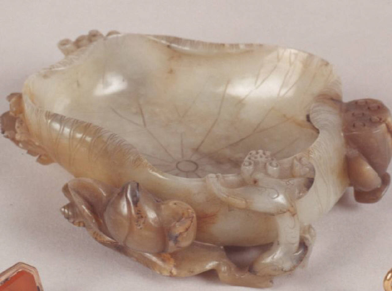 Posacenere in giada decorato con foglie di loto, rane e granchio.
