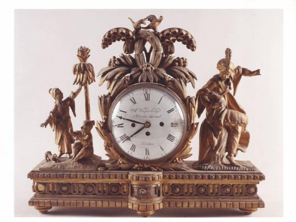 - NOTIZIE STORICO CRITICHE L'orologio presenta una composizione piuttosto originale, caratterizzata da un gusto orientaleggiante ed esotico. Non si sono reperite notizie sugli autori.