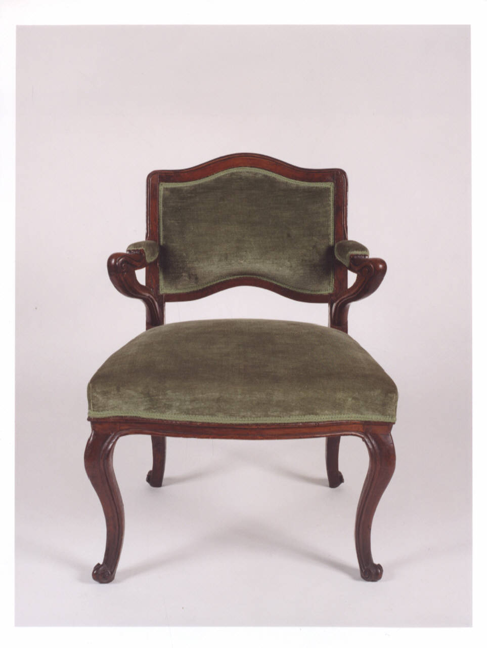 Poltrona in noce rivestita di velluto verde.