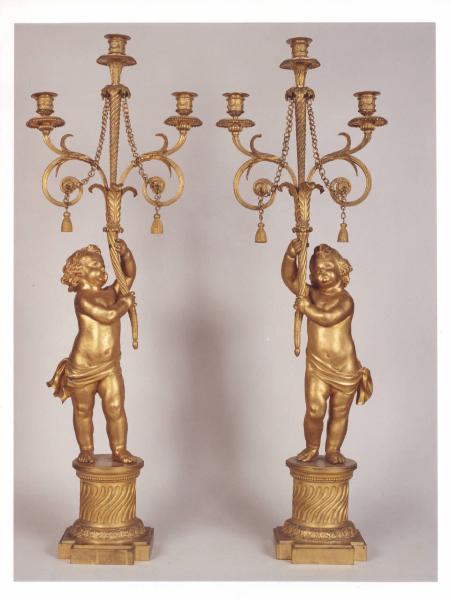 Coppia di candelabri in bronzo dorato con base a forma di colonna scanalata; putto reggente una cornucopia dalla quale emerge un torciglione che regge la luce centrale e i due bracci laterali a foglia d'acanto da cui riccioli pendono due elementi decorativi a imitazione delle nappe.