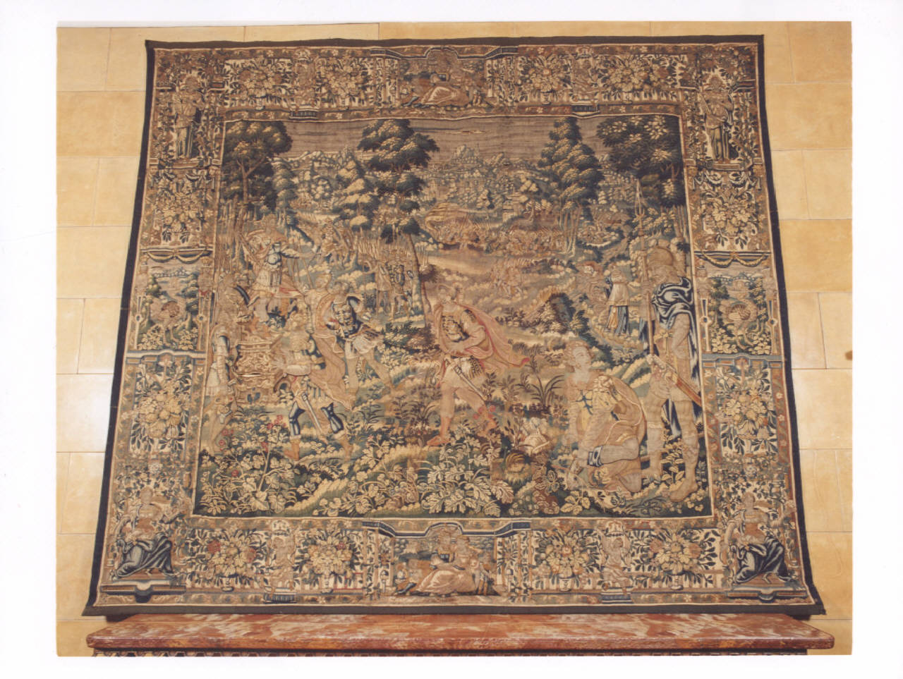 - NOTIZIE STORICO CRITICHE L'arazzo costituisce un esempio di rappresentazione dei giardini, richiamando una vita elegantemente cortigiana. Squadrati e delimitati da eleganti pergole, sono popolati da statue di dei dell'Olimpo oppure da figure appartenenti al Mito. Le bordure si presentano con ricchezza di elementi vegetali, spesso suddivise in piccoli riquadri da colonnine, da fregi intrecciati, da piccole erme su una struttura a grottesche floreali, dove si alternano, senza nessuna simmetria, personaggi allegorici e mitologici, profani e sacri, come l'opera in esame evidenzia. Questa particolare produzione fu caratteristica delle manifatture di Bruxelles.\nManifattura dell'opera non è stata identificata: Fiandre, Enghien o Anversa.