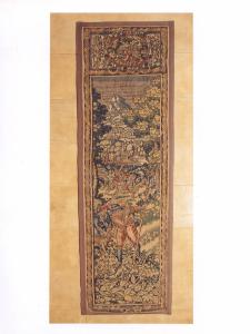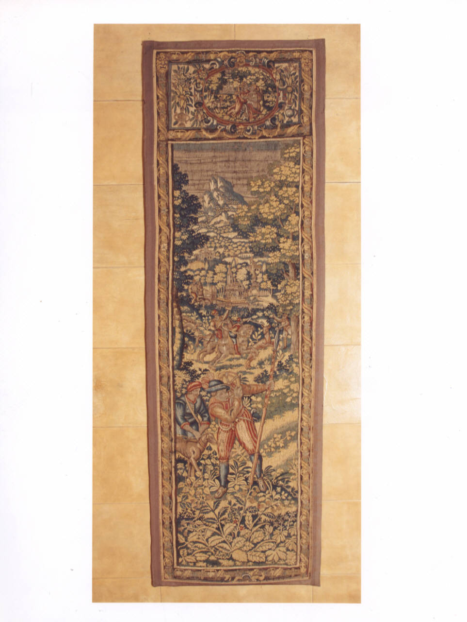 - NOTIZIE STORICO CRITICHE L'arazzo, anche se privo della marca indicante il luogo di produzione, rivela, per lo stile e la tessitura, la manifattura di Bruxelles. Doveva far parte di un panno più ampio, come suggerisce anche il volto del giovane rivolto verso qualcuno che ora non si scorge più. Semplice ma di effetto la bordura a torciglione "tridimensionale" e il lussureggiante giardino.