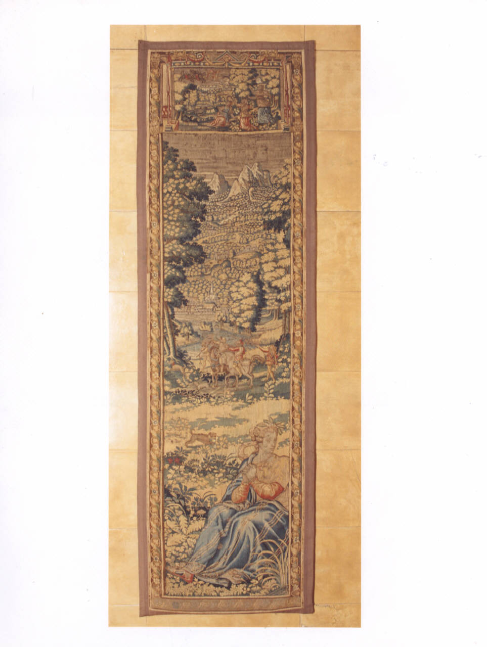 Frammento di arazzo di manifattura Bruxelles con Cerere e cavalieri sullo sfondo.\nFoderatura posteriore a fasce con tessuto di canapa.