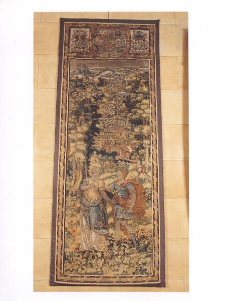 - NOTIZIE STORICO CRITICHE L'arazzo, anche se privo della marca indicante il luogo di produzione, rivela, per lo stile e la tessitura, la manifattura di Bruxelles. Doveva, forse, far parte di un panno più ampio, anche se la scena non sembra tronacata o mancante di parti. Semplice ma di effetto la bordura a torciglione "tridimensionale" e il lussureggiante giardino. Particolarmente dettagliate anche le figure in primo piano.
