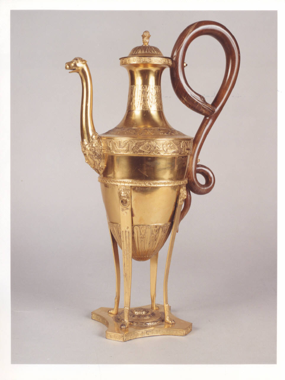Caffettiera in argento dorato con decoro a greche sul coperchio, a foglie sul collo; la base del corpo presenta un motivo a cigni che si innesta sul beccuccio a testa di animale e base con mascherone femminile; piccole maschere a testa d'animale nei sostegni; base quadrangolare piena con medaglione centrale. Manico in legno a forma di serpente.