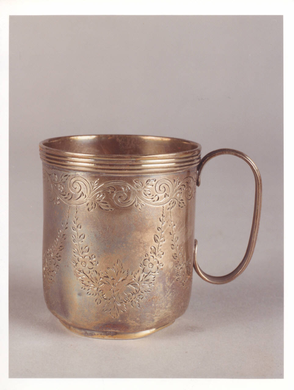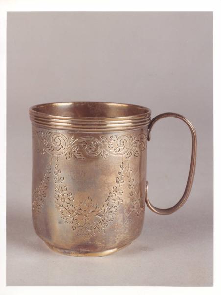 Tazzina a un manico in argento con bordo scanalato e decorazione a festoni di fiori e foglie.