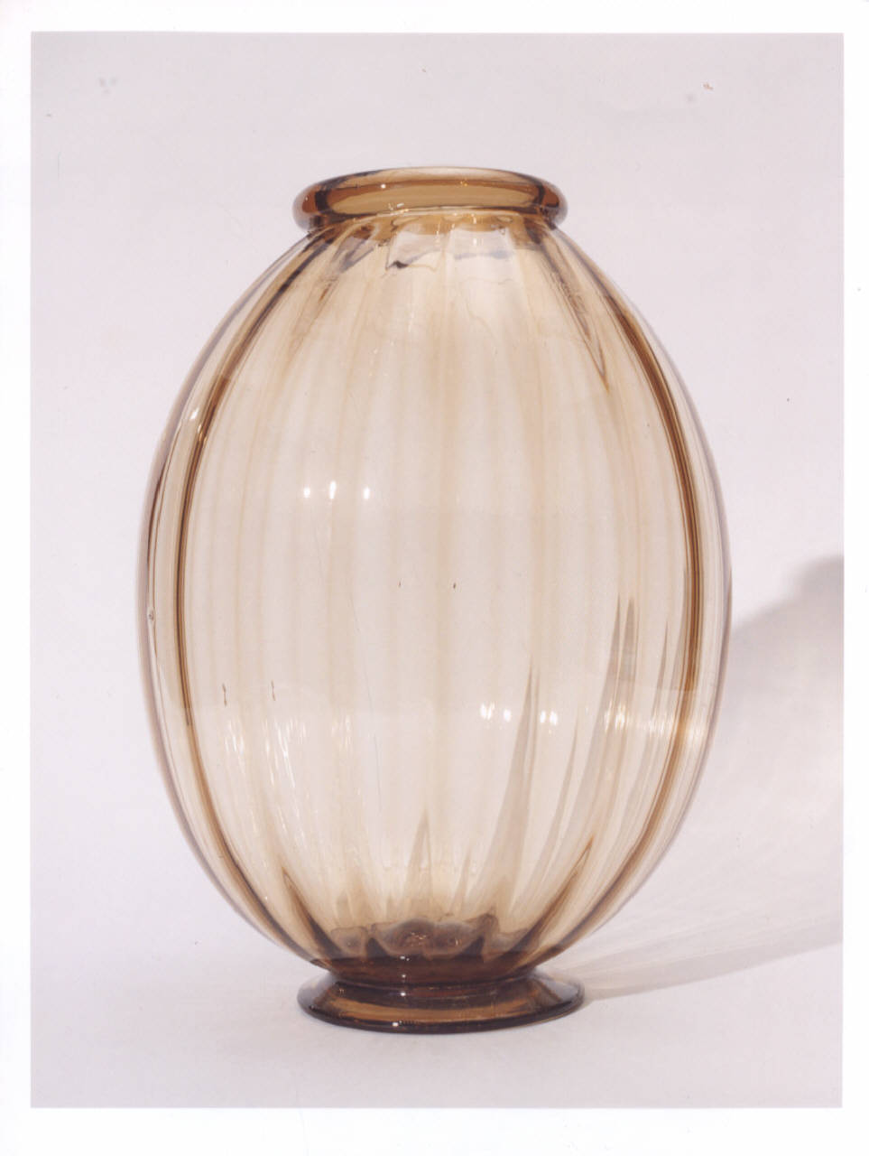 Semplice vaso in vetro beige leggermente scanalato.