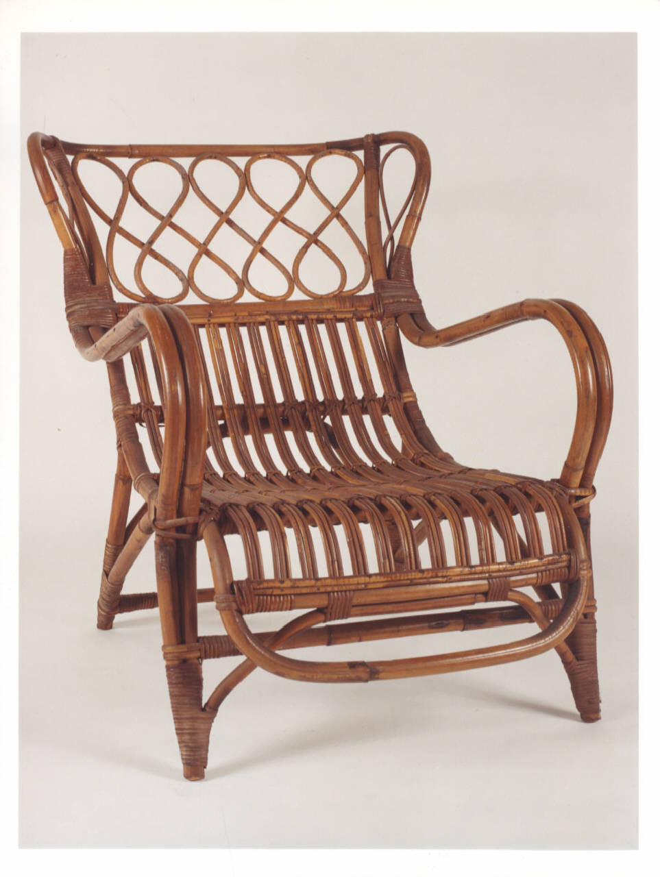 Poltroncina in vimine con la parte superiore dello schienale traforata e con leggero decoro a forma di otto.