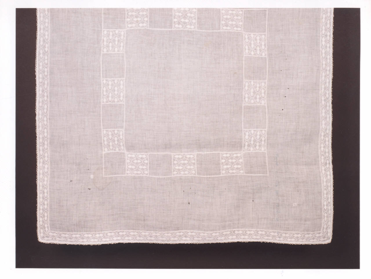Tovaglietta in lino con decoro centrale quadrato: ricamo a punto pieno.
