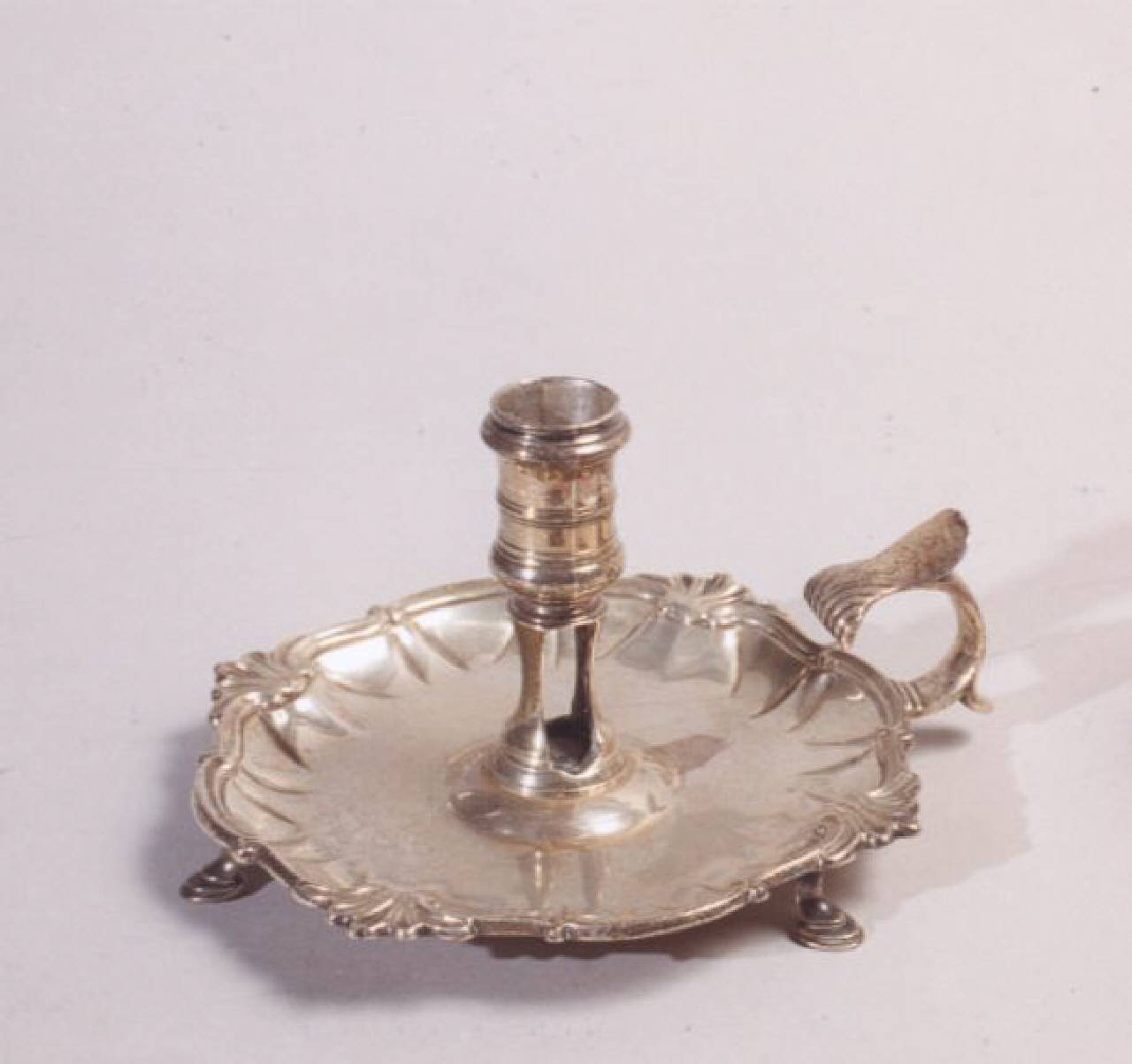 Bugia in argento costituita da una base leggermente sagomata sostenuta da quattro piedini; manico ricurvo a forma di mano guantata, portacandela centrale.