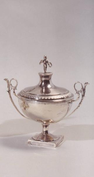 Zuccheriera con piede rotondo poggiante su base quadrata; coperchio inciso a fogliette e terminante con putto che sorregge delle corone d'alloro, manici laterali sottili e arcuati a forma di animale fantastico.