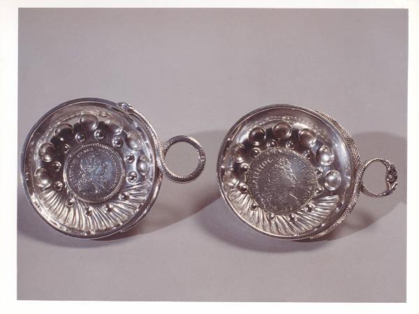 Tastevin: piccola ciotola in argento usata per la degustazione del vino; medaglia centrale e manico a forma di serpente.