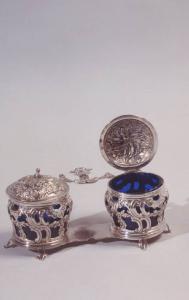 Mostardiera doppia lavorata a sbalzo e a traforo; coperchio incernierato e interni in vetro blu.