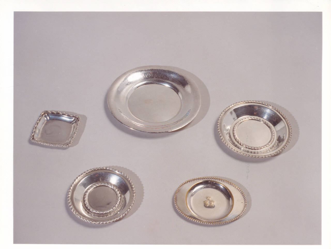 Piattini d'argento e metallo argentato, probabilmente dei sottobicchieri e sottobottiglia: dodici martellati, quattro con bordo superiore e inferiore a cordoncino, due leggermente ovali con decoro centrale e dodici quadrati in argento con piccola cordonatura sul bordo superiore.