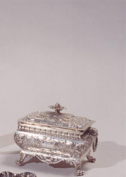 Cofanetto in argento cesellato a forma di sarcofago poggiante su quattro piedini a zampa di leone; coperchio a incastro e piccolo pomolo a forma di fiore.
