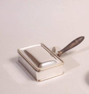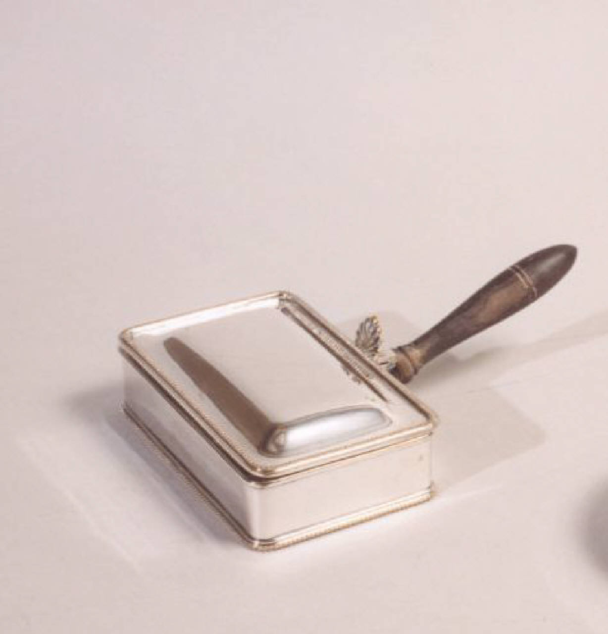 Portadolci in metallo argentato a forma di scatola, manico in legno con piccola palmetta.