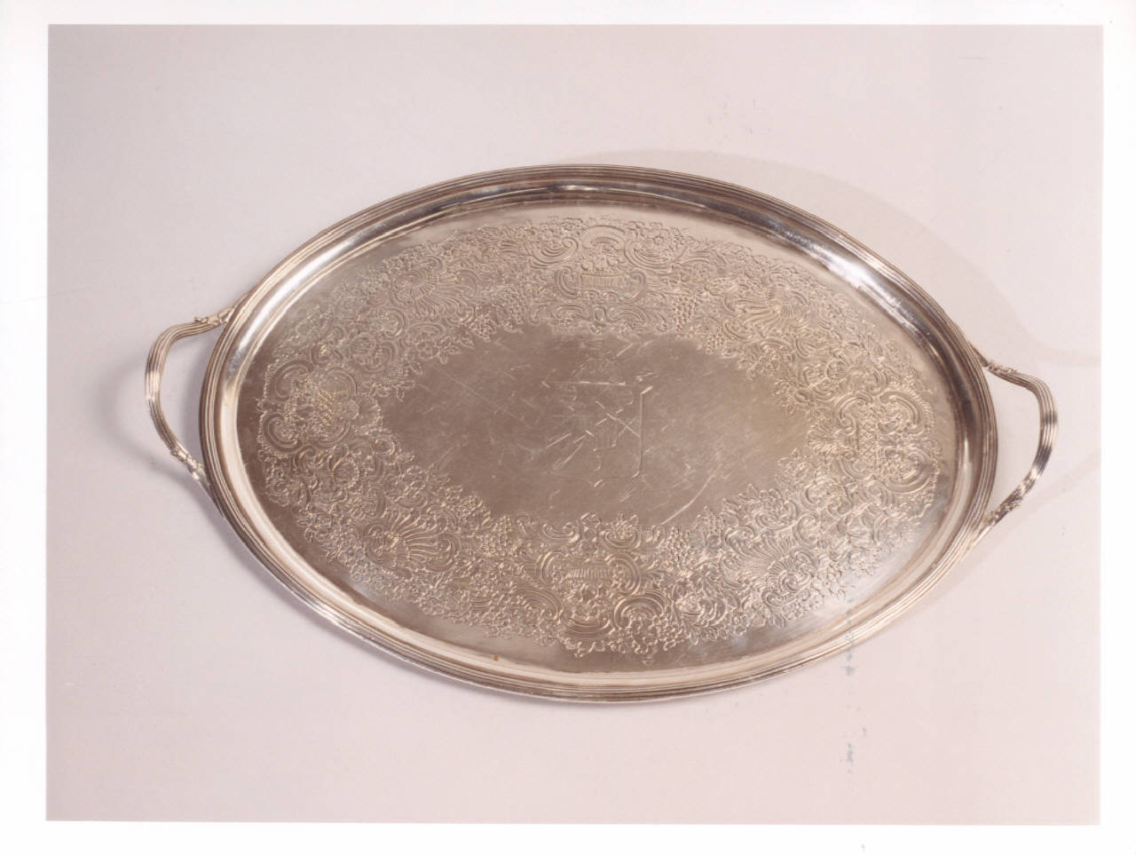 Vassoio di forma ovale con fondo inciso con fiori e frutti, stemma centrale; manici laterali zigrinati.