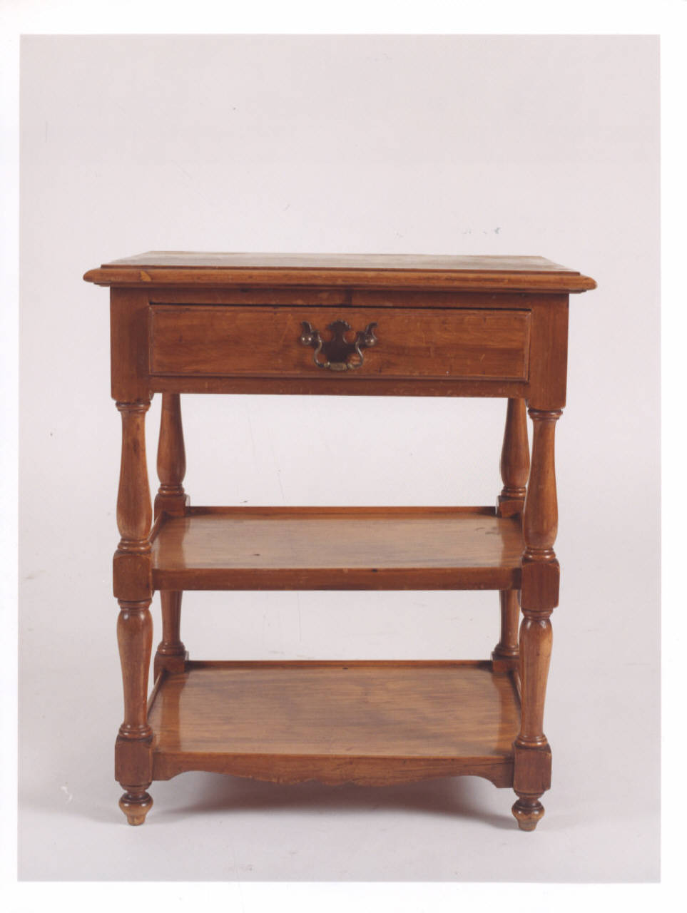 Comodino a doppio ripiano con sostegni a rocchetto, piedini a cipolla, piano con un cassetto centrale.