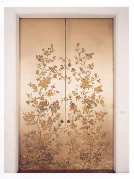 Porta scorrevole interna a doppio pannello rivestita di seta con prezioso ricamo a punto pieno e a fili policromi con motivo decorativo a tralcio fiorito.