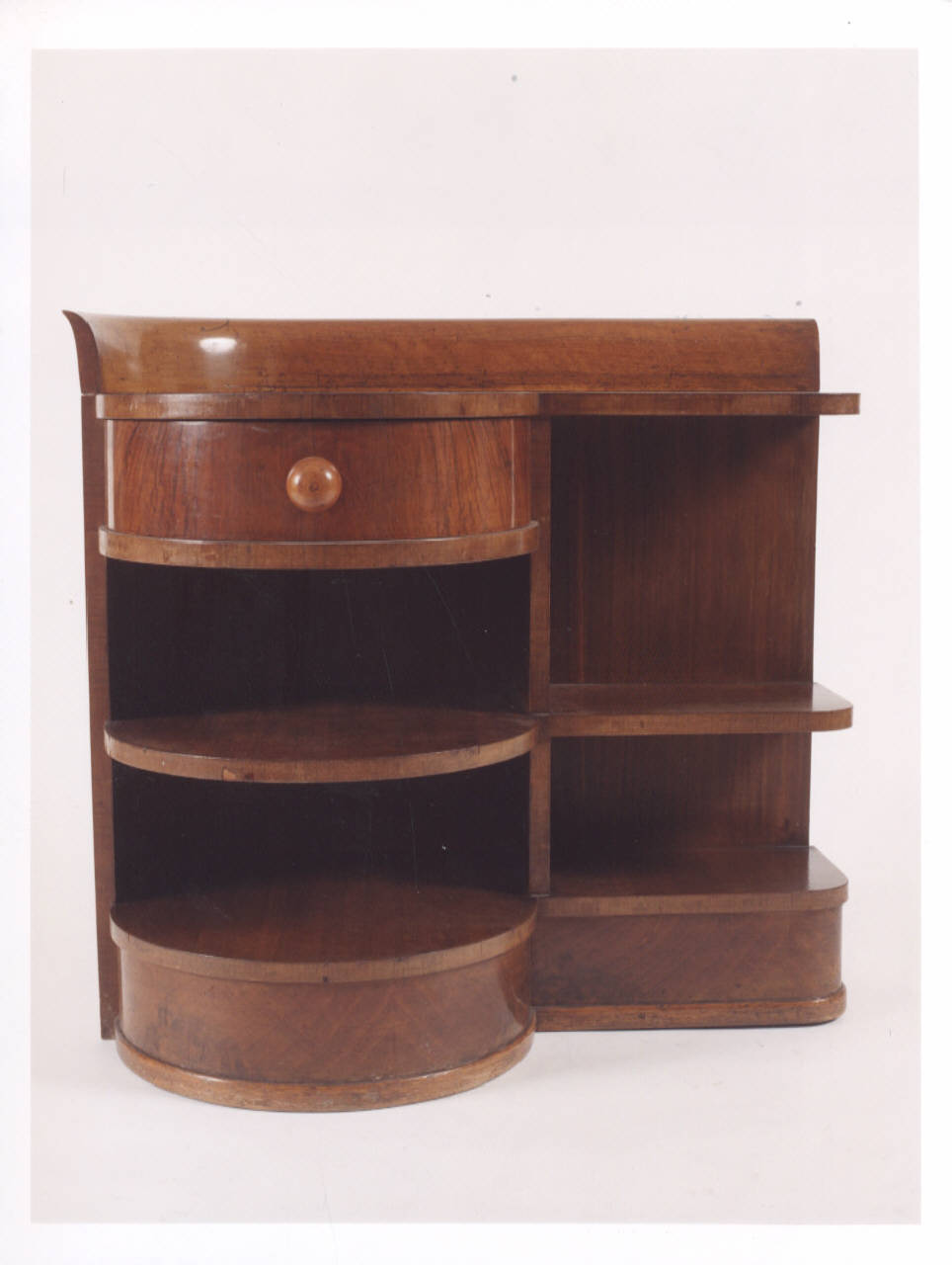 Esemplare della coppia di comodini realizzati in legno in forme sagomate e speculari, attrezzati con vani a giorno e un unico cassetto in corrispondenza dell¿estremità stondata.